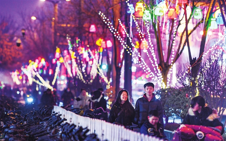 2月5日,亲贤街上灯火璀璨,节日氛围浓郁,市民徜徉其间。