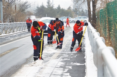 2月5日上午,环卫工人正在漪汾桥匝道清除道路冰雪,保障市民出行安全。 张昊宇 摄