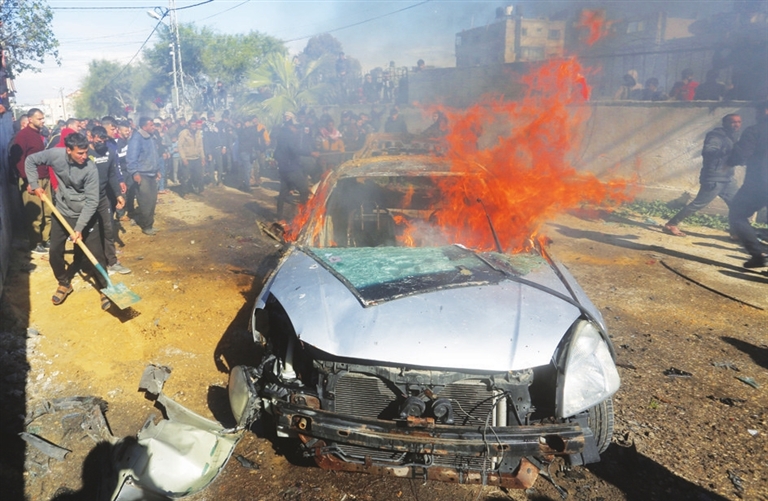 2月4日,在加沙地带南部城市拉法,一辆汽车遭以军空袭后起火。新华社 发
