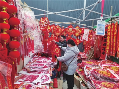 多家春联销售摊位前,人头攒动,询价问货,好不热闹。“我们每天早上8点就开门营业,到晚上7点多才收摊。从腊八前后开始,生意越来越好。临近年根儿,顾客越来越多,我们生意做得也特别有劲儿!”问及今年最受欢迎的商品,靠近市场北门的春联摊摊主张大姐说:“最紧俏的是新出的磁吸式对联,因为现在大家都住在单元楼里,比起以往需要胶粘的纸质春联,这种春联可以直接吸在外门上,方便简单,而且还不会留下难以处理的胶水印,特别受欢迎。”