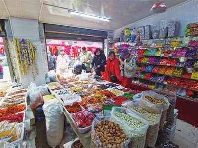 糖果和炒货,也是节日餐桌上不可或缺的年货。虽然同质化摊位有很多,但记者注意到,其中一家干果店门前顾客尤其多。“他们家干了几十年了,小时候置办年货爸妈就带着我们来这家店,都习惯了。而且,他家的东西物美价廉,承诺缺一两补一斤,买着也放心!”市民小王说。