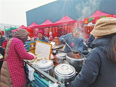 临近中午,各个摊位前还是有不少顾客在选购年货,摊主们为了不影响生意,都选择就近买点儿包子或者盒饭现场解决午饭问题。