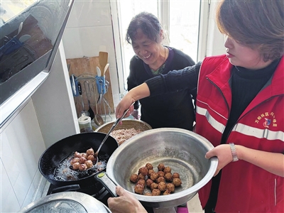 9时许,有人敲门。老人开门一看,是玉园南社区的网格员杨恩英,年前入户看望。杨恩英好奇地问:“大娘,您一个人,为啥剁这么多肉?”得知缘由后,网格员立即叫来李红蓓、张补兰另外两名网格员。3个人一起帮忙,让老人去休息。乔大娘前不久摔伤了腰,尚未痊愈。在厨房弯腰忙了会儿,确实有些受不了。她退出厨房,转身去给大家倒热水。3名网格员分工,有的剁肉、有的拌馅、有的炸制。2个小时后,满满一大盆丸子出炉了。