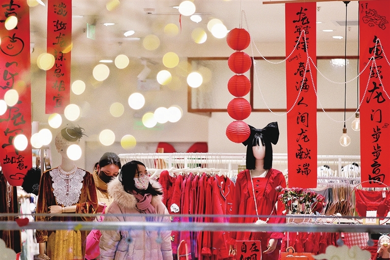 “今年龙年,正好是我家12岁儿子的本命年,刚刚已经在前面专柜给买了一套红色的龙纹秋衣裤,现在准备买一套有龙图案的红色冲锋衣,给孩子一个新年好彩头。”正在一家品牌童装专柜选购服装的常女士告诉记者。龙年春节里,各类品名中带有“龙”字的商品也牢牢占据了C位。大吉大利的龙年对联、招财纳福的龙年福字、精致独特的龙年年宵花、喜气应景的龙年红包、呆萌可爱的龙年玩偶……价格十几元到上百元不等,亲民实惠,颇受欢迎。