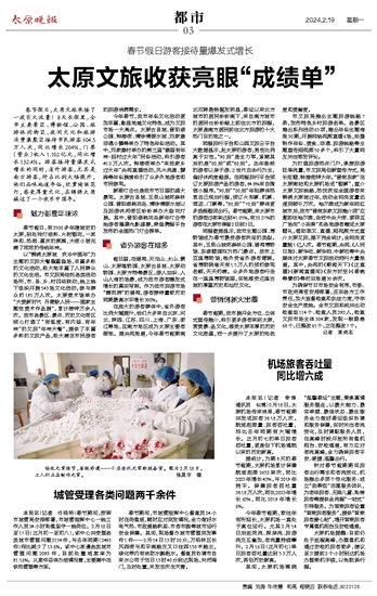 据统计,为期8天的春节假期,太原机场累计保障航班起降2652架次,同比2023年增长43%,与2019年持平。保障旅客吞吐量38.18万人次,同比2023年增长63%,同比2019年增长6%。