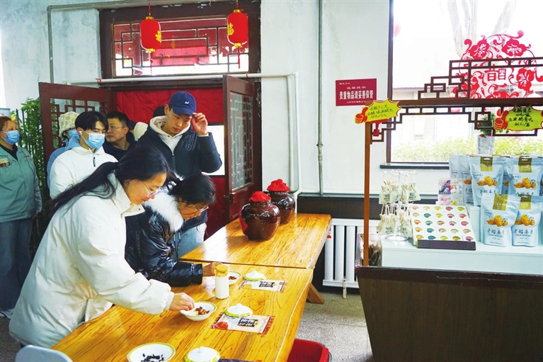 春节期间,东湖醋园推出独具特色的山西老陈醋体验活动。图为2月19日,游客在试吃醋泡黄豆、醋泡花生等特色产品。 张澍宏 摄