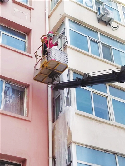 入户查看,发现是暖气管破裂所致。给住户打通电话,对方也很着急,但短期回不来。网格员叫来维修人员,紧急修复了暖气管。随后,社区协调附近的施工单位,调来一辆云梯车,从上至下敲击冰块。忙活了数小时,终于将所有冰挂清除。