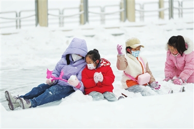 大小公园,孩子们兴奋地在雪地里嬉戏,大人们则在一旁用手机记录下欢乐时刻。