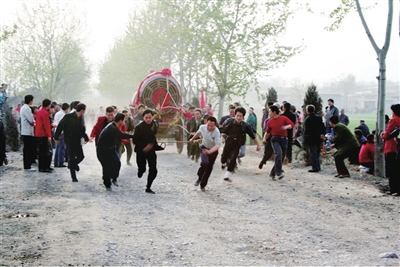 趣话年年流传,“人拉鼓车”岁岁沿袭,究竟“鹿死谁手”各持己见。于是,他们决定每年正月正,在逢庙会时举办人拉鼓车赛。