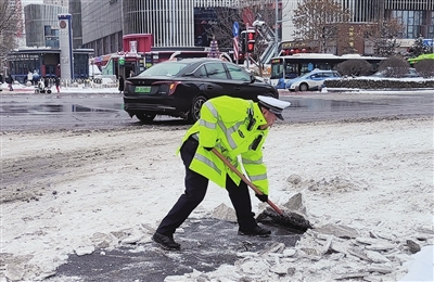 2月21日,在并州路并州西街口,一位交警在执勤间隙,拿起铁锹快速地铲除积雪,时不时叮嘱行人注意脚下安全。 李娟 摄
