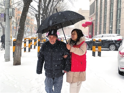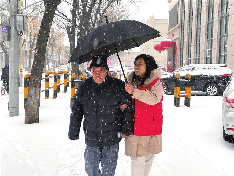 拿上钥匙后,社区网格员打着伞,冒雪护送老人回家。随后又将其家门钥匙拿回社区保存,以便救急。