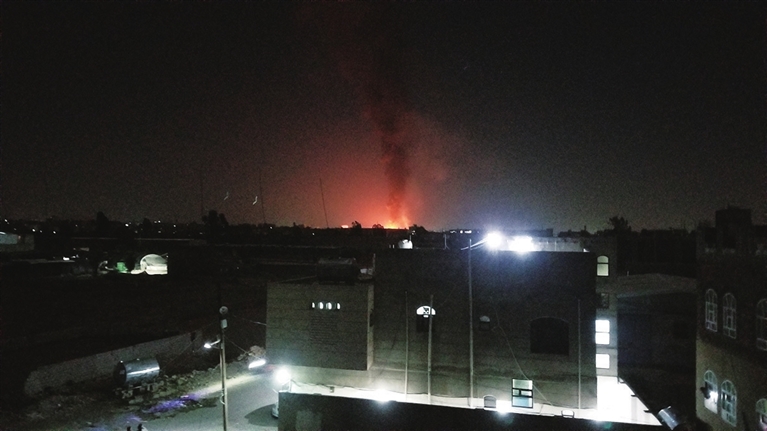 2月24日,也门首都遭到美英战机空袭后升起浓烟(手机拍摄)。