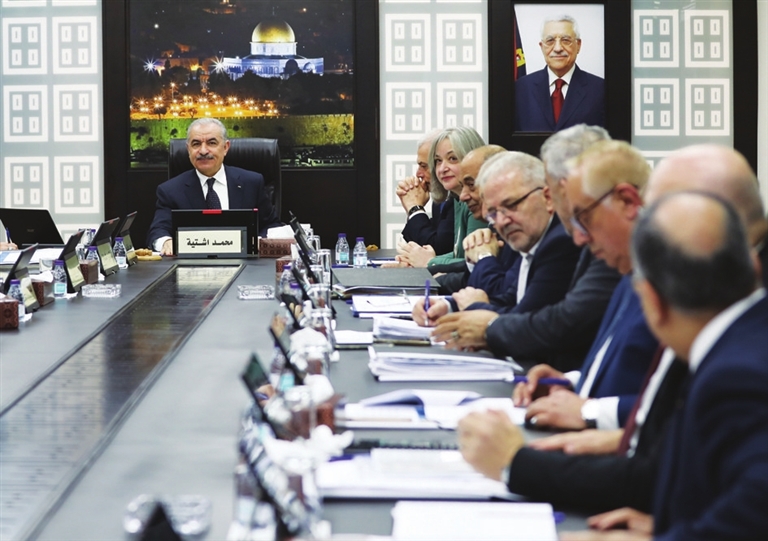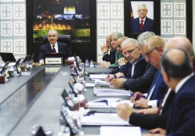 2月26日,巴勒斯坦总理阿什提耶(后)在约旦河西岸城市拉姆安拉举行的政府工作会议发表讲话,宣布巴勒斯坦政府辞职。