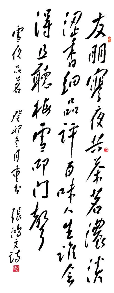 这个书法展起意偶然。鸿文先生经常在麒麟画馆闲坐喝茶,与张艺兴说起写过的小诗和抄录的著名诗词。越说越来劲,艺兴说那就办个展吧。整理、装裱、布展一通张罗,1月29日,画馆“梅雪报春·张鸿文书梅雪诗词主题展”开展,给腊月里的开化寺带来一丝暖意。