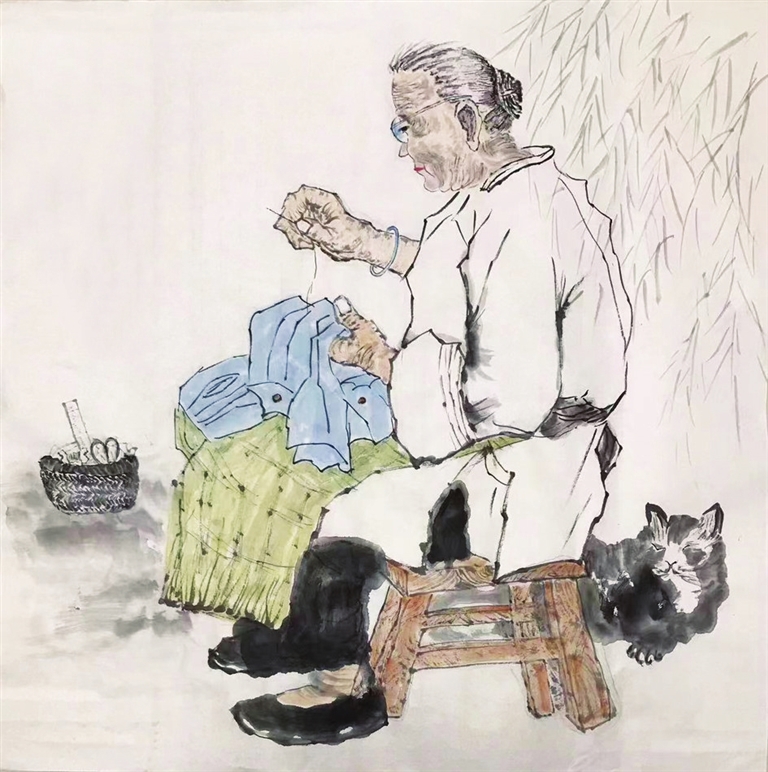 奶奶坐在床上,把棉花摊铺在被里上,轻轻地这儿摸摸那儿按按,凭手感,厚的地方揭下一点,薄的部位添上一点,她耐心细致地把棉花絮得均匀平整,再用纱网布覆盖住棉花便开始缝被。奶奶眼不花手不抖,自己穿针引线,戴上顶针,用指关节已变粗的手指紧紧捏住细长的钢针,弯腰弓背,飞针走线。