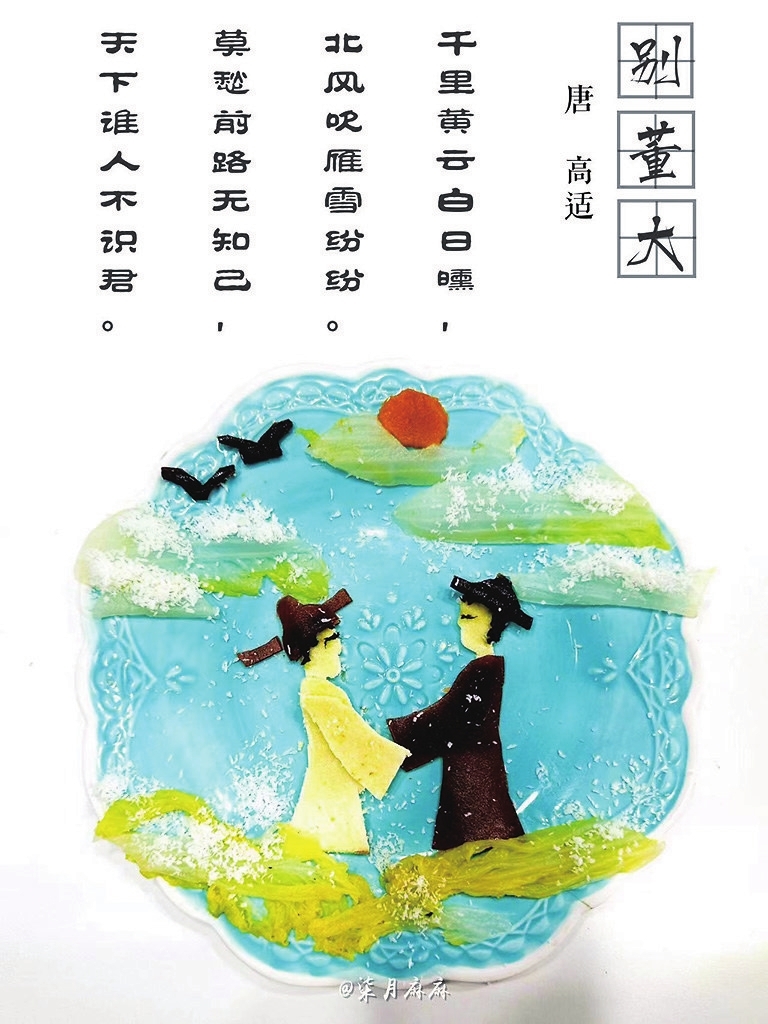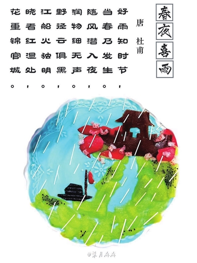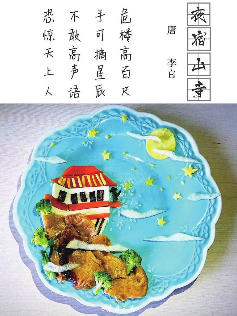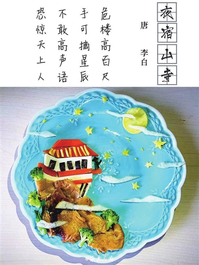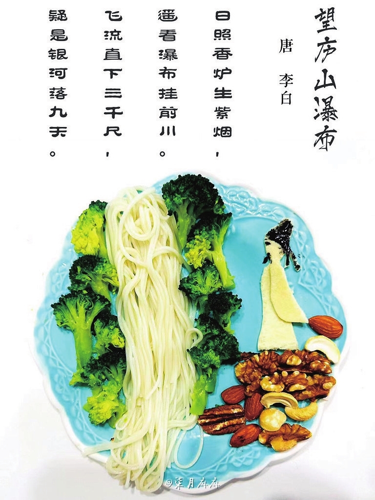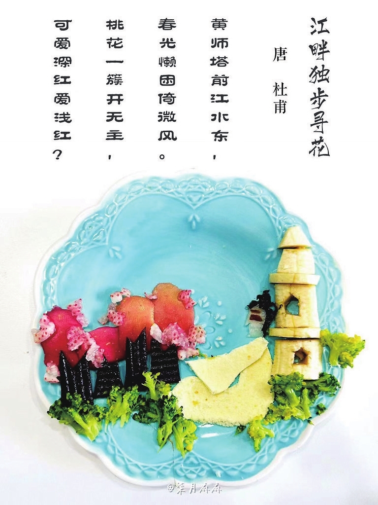 面条做的白色“瀑布”从西兰花做的“山”中飞流而下,仿佛银河落入人间,站在坚果做成的“小山”上,“李白”遥望前方,若有所思。在青绿色的盘子中,古诗早餐《望庐山瀑布》充满了令人回味的意境,精致有趣。春季开学后,春天主题的诗词早餐上桌了:《江畔独步寻花·其五》里那“深红”与“浅红”,《春夜喜雨》里的“晓看红湿处,花重锦官城”,惊艳了春日的早晨……