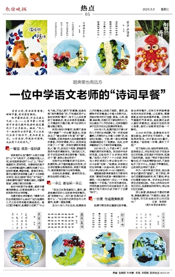 把早餐做成诗,开启充满元气的一天——太原市第二外国语中学语文教师赵婧的朋友圈吸引了众多粉丝。她说:“和儿子一起制作古诗早餐,可以让我们在亲子陪伴中,更加热爱生活。心存美好,即便面对困难,也会有十足的底气。”