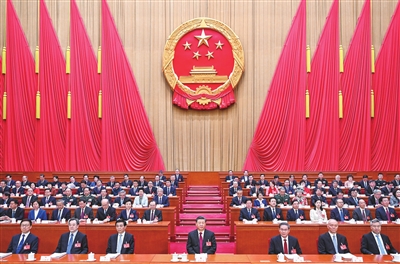 人民大会堂大礼堂气氛隆重热烈,主席台帷幕正中的国徽在鲜艳的红旗映衬下熠熠生辉。