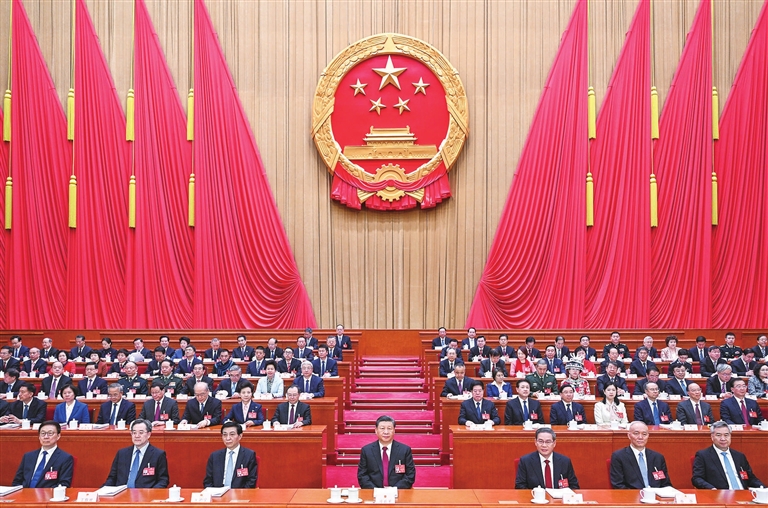 习近平、李强、王沪宁、蔡奇、丁薛祥、李希、韩正和大会主席团成员在主席台就座。