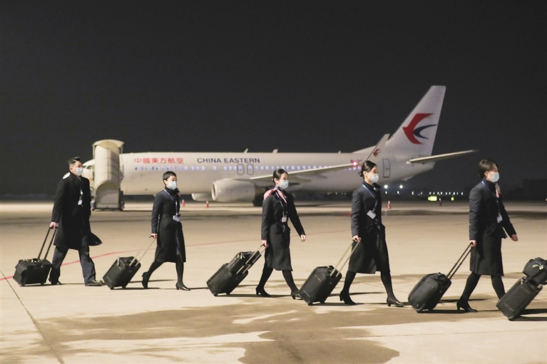 2月27日凌晨,太原武宿国际机场,飞机客舱门橙黄的灯光点亮了清冷的夜色。这趟飞往博鳌的MU5461次航班上,乘务长宗圆站在舱门前微笑迎接乘客。