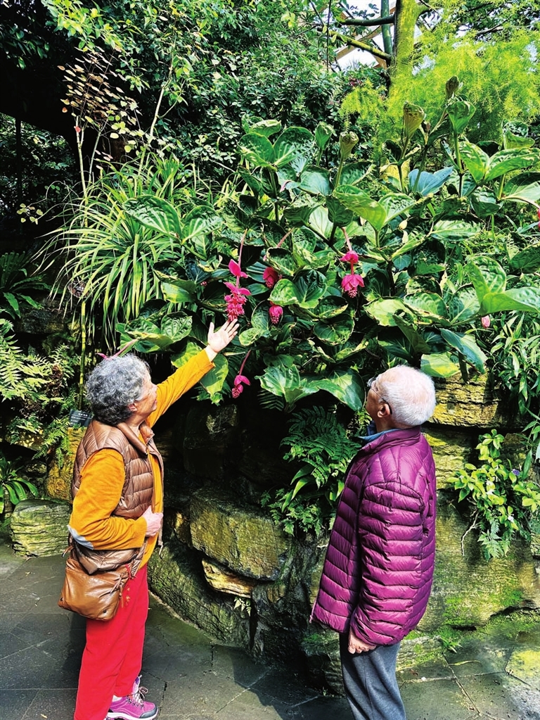 一行人兴致盎然地走进了热带植物馆,在雾气缭绕的大厅里,五花八门高低错落的树木,让我眼前一亮,温度也顿时升高了不少。外孙女开玩笑说:“姥姥,感受到三亚的气候了吧?想去海南玩,就到植物园来吧!”