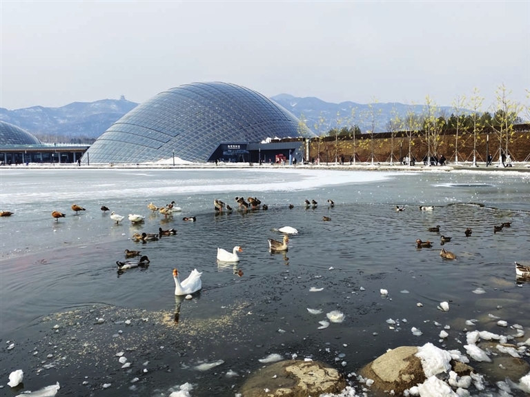 进入植物园区,在还结着薄冰的湖的对岸,出现在人们眼前的是几个灰色的,大小不一的半圆形建筑,这就是几个展馆的圆拱形屋顶了。