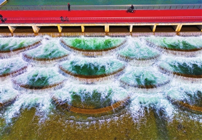3月9日,汾河景区柴村桥段的鱼鳞瀑景观开始放水,一层一层的叠瀑,行人纷纷驻足欣赏拍摄。 张昊宇 摄