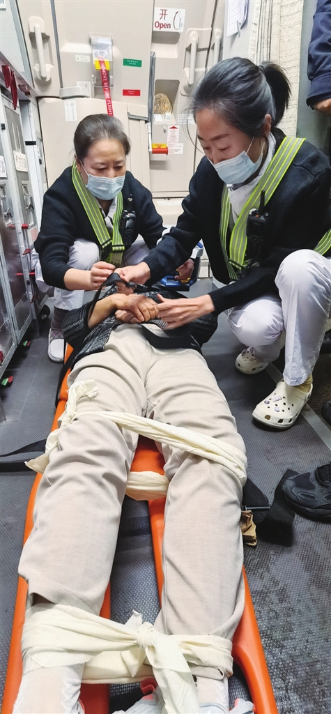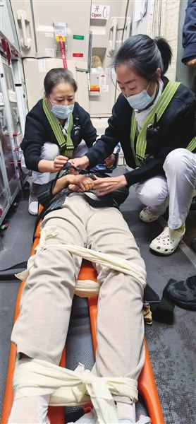 医生辅助患病旅客进行侧卧位,让旅客保持气道畅通,在进行生命体征监护的同时,以最快的速度将旅客抬下飞机,并与120急救进行对接和转运,转送到上一级医院接受治疗后,旅客脱离危险。