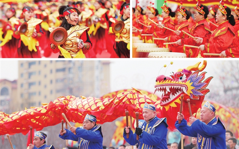 3月10日,“金龙贺岁 战鼓迎春”锣鼓大赛在玉泉山城郊森林公园举行。14支锣鼓队千余名选手同台竞技,锣鼓争锋,铙钹竞鸣,舞龙贺春。