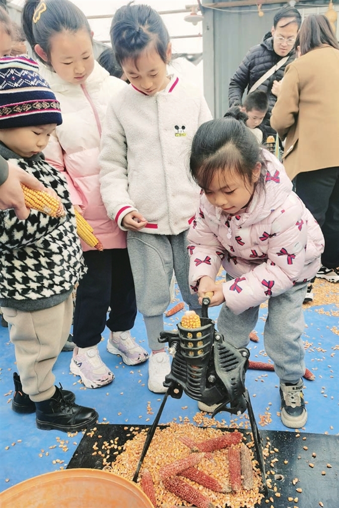 如何使用机器剥玉米粒,是他们首个体验的活动。4岁的马一牧双手紧握摇杆,双腿半蹲发力,看着机器中的玉米棒,目不转睛。在摇杆的转动下,玉米棒缓慢下降,金黄的玉米粒纷纷脱落在地。马一牧开心不已,身旁的小朋友一个个瞪大好奇的眼睛,跃跃欲试。“手中的玉米粒既是果实,也是种子。”研学活动老师在一旁,不失时机地给孩子们讲解相关的农业知识。