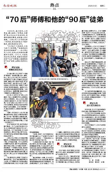 “王兴收了个好徒弟,王龙飞找了个好师傅。”“他俩是我们身边的师徒榜样”……在太原公交二公司,这对公交师徒的故事被传为佳话。3月5日,记者走近这对公交师徒,看看当经验老到的“70后”师傅遇上腼腆慢热的“90后”徒弟,会擦出怎样的火花?