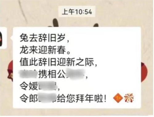 图中这则新春祝福语为女子携丈夫和一双儿女给友人拜年的微信截图。可细看,“令嫒”“令郎”用错了地方,怎么能携对方的儿女给对方拜年呢?