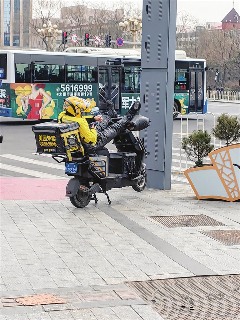 这是3月13日12时许,在新建路府西街路口西北角拍到的。一个快递员坐在电动车上,两条腿搭在车把手上,如此坐姿不雅观。