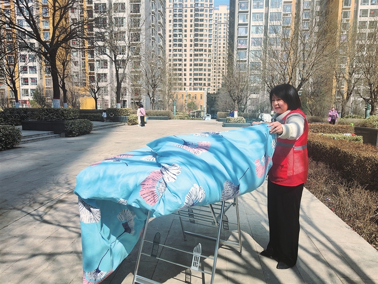 “大爷,我们帮您把厚被子拿下去晒一晒。”3月14日一大早,趁着天气晴好,御德苑社区网格员李艳琴与同事抓紧时间入户。他们先来到87岁的杜大爷家,把厚被子、薄被子一并抱到楼下,搭在晾衣绳上。老人腿有残疾,女儿嫁到外地后,一直独居。他感动地说:“社区真贴心,我正想着换薄被子呢。”