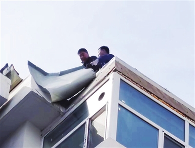 本报讯(记者 郭晓华 通讯员 刘芳 文/摄)邮电前街1号煤监局宿舍居民楼楼顶的遮雨板,因年久失修而松动,大风吹过摇摇欲坠,存在安全隐患。并州路三社区网格员接到居民反映后,立即上报社区,并与宿舍所属单位的后勤部门积极沟通,及时消除安全隐患,保障了居民安全。
