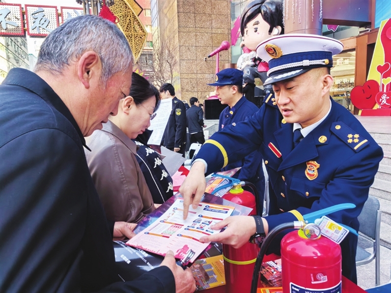 3月15日,太原市迎泽区消防救援大队监督执法人员在柳巷开展“3·15”国际消费者权益日消防打假宣传活动,为市民讲解如何辨别真伪消防设备。 米国伟 摄