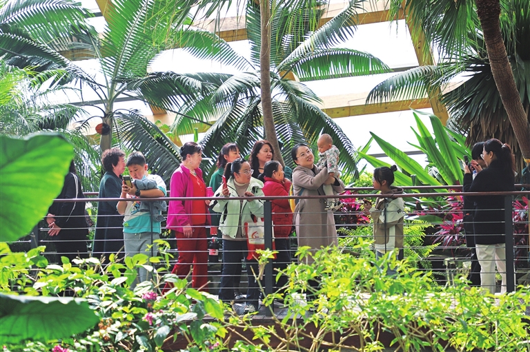 3月17日,太原植物园内,游人与绿色植物“亲密接触”,感受春天的气息。