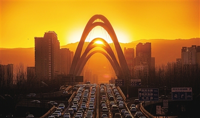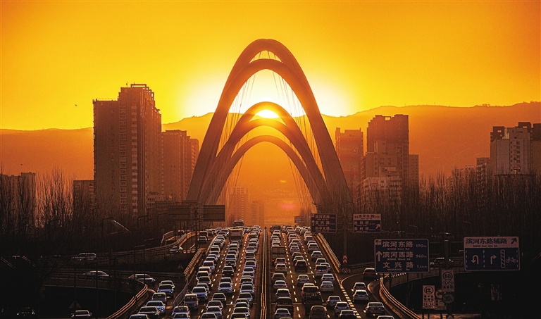 3月19日,“悬挂”在北中环桥桥拱之上的夕阳,将天色染成一片金黄,城市美丽如画。