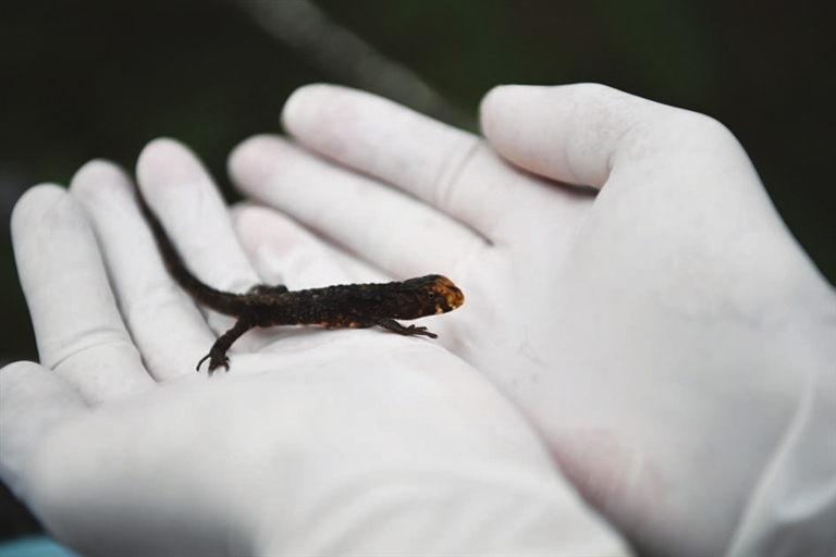 近日,随着气温转暖回升,位于广西贺州市的广西大桂山鳄蜥国家级自然保护区鳄蜥进入繁殖季。在位于保护区内的鳄蜥繁育研究基地,已有小鳄蜥诞生,一些冬眠苏醒的成体鳄蜥也陆续活跃起来进入待产、交配阶段。鳄蜥是国家一级保护野生动物。
