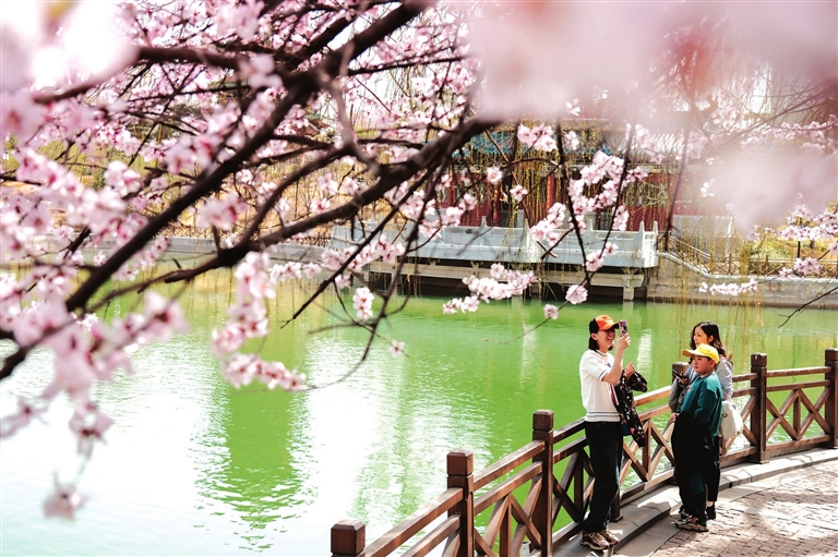 3月22日,迎泽公园桃花与湖水相映成趣,游人纷纷拍照留念。王韵菲 摄