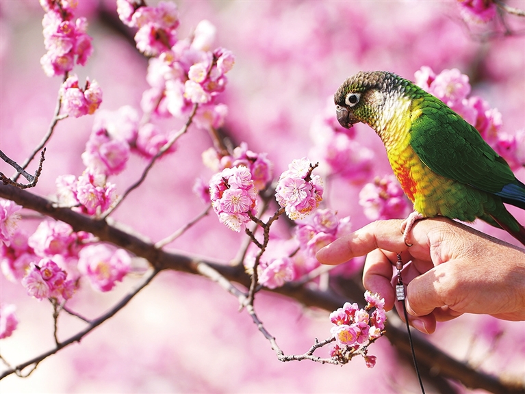 3月22日,在河北省石家庄市水上公园,一位游园的市民让自己的宠物鹦鹉“赏花”。春日花开,踏青赏景正当时。 新华社 发