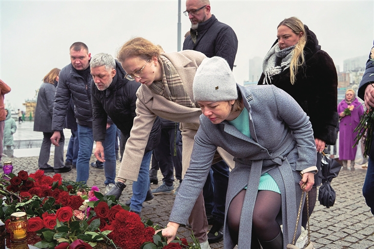 3月23日,俄罗斯符拉迪沃斯托克市举行活动悼念莫斯科近郊恐袭事件遇难者,当地民众在中心广场献花。 新华社 发