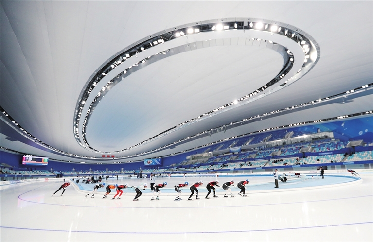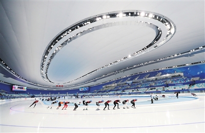 3月23日,参赛选手在比赛中。当日,2023-2024赛季全国速度滑冰冠军赛男子集体出发比赛在北京国家速滑馆举行。 新华社 发