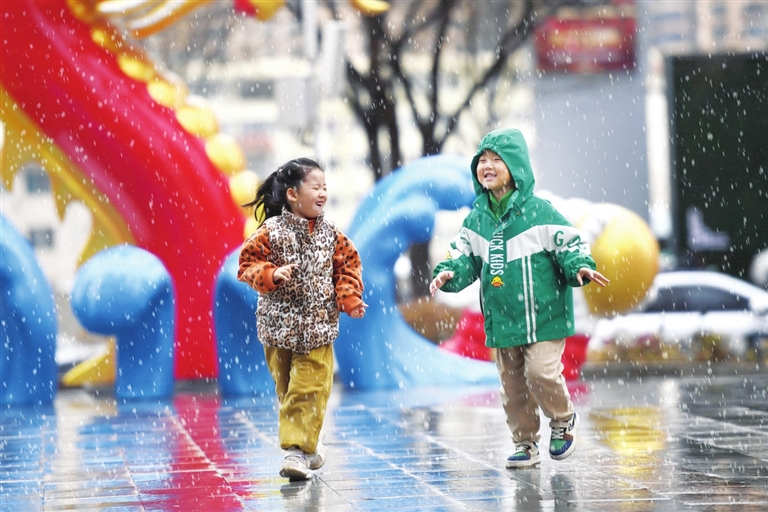 3月24日,太原喜降春雨,省城街头,两名孩子在雨中嬉戏。 邓寅明 摄