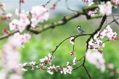 3月20日,小鸟在贵州省遵义市余庆县子营街道上里社区桃花树上停歇。