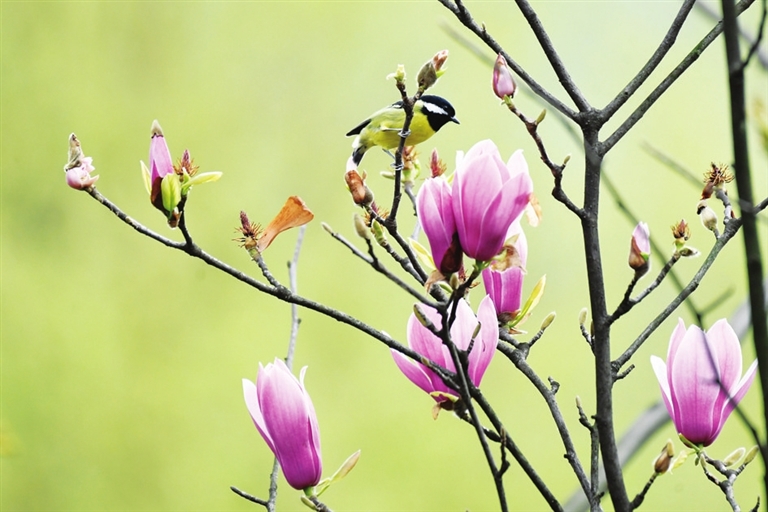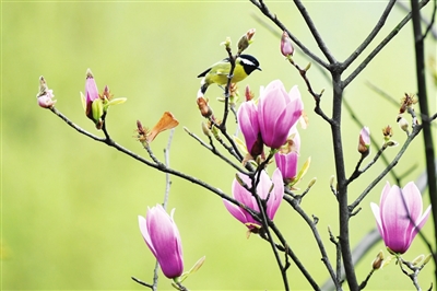 3月19日,贵州省仁怀市楠竹林公园,小鸟在玉兰花间停歇。