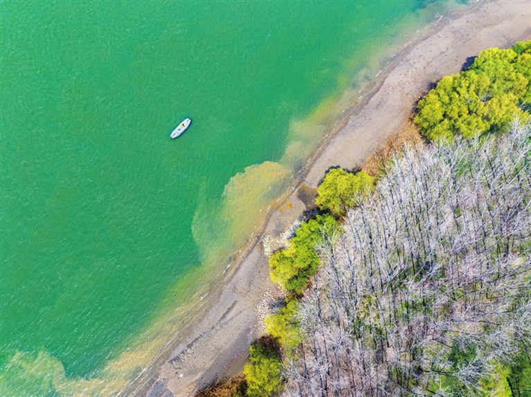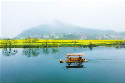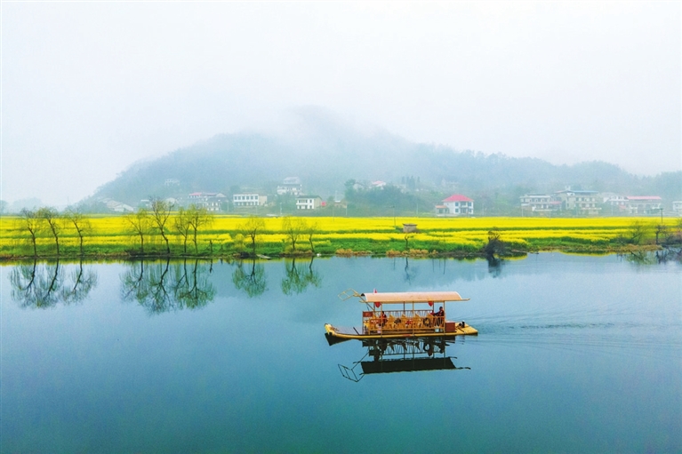 3月17日,在湖南省娄底市双峰县梓门桥镇街埠头村,游客乘船在侧水河上游玩。