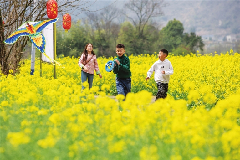 3月16日,小朋友在贵州省安顺市西秀区大西桥镇鲍家屯村油菜花田间放风筝。