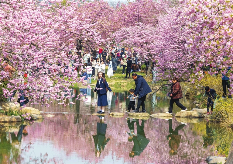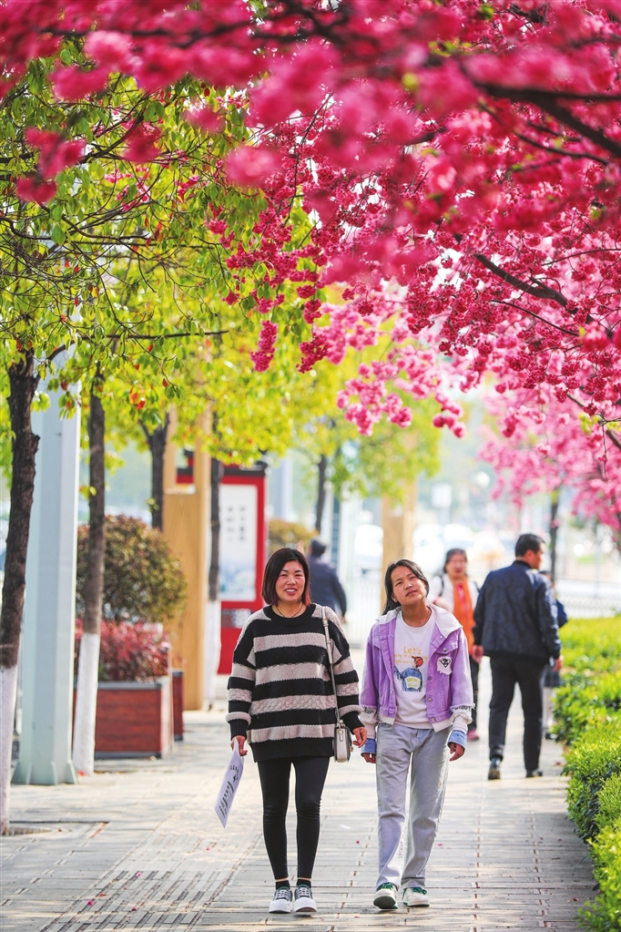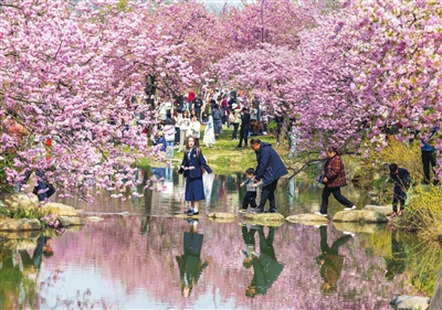 3月15日,游客在云南省曲靖市玉林广场樱花园赏樱游览。