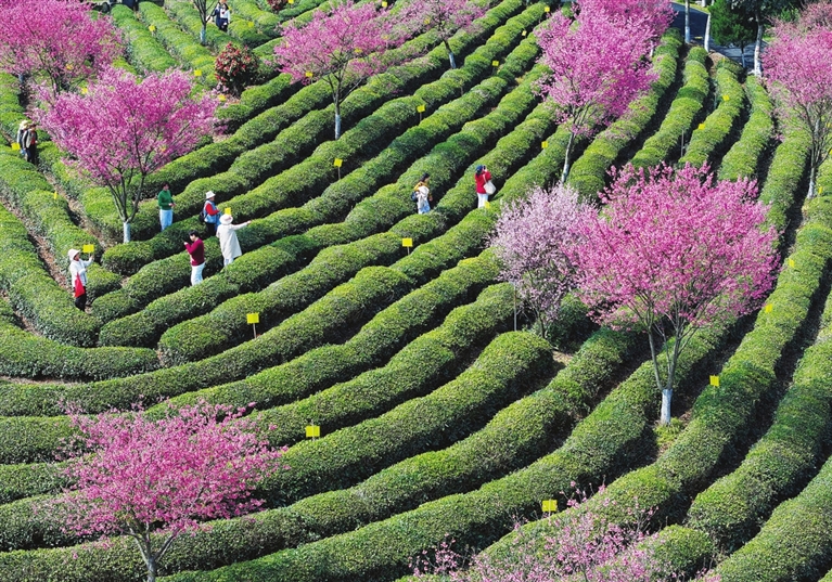 3月19日,在安徽省黄山市徽州区谢裕大茶博园,游客在欣赏樱花茶园春景。